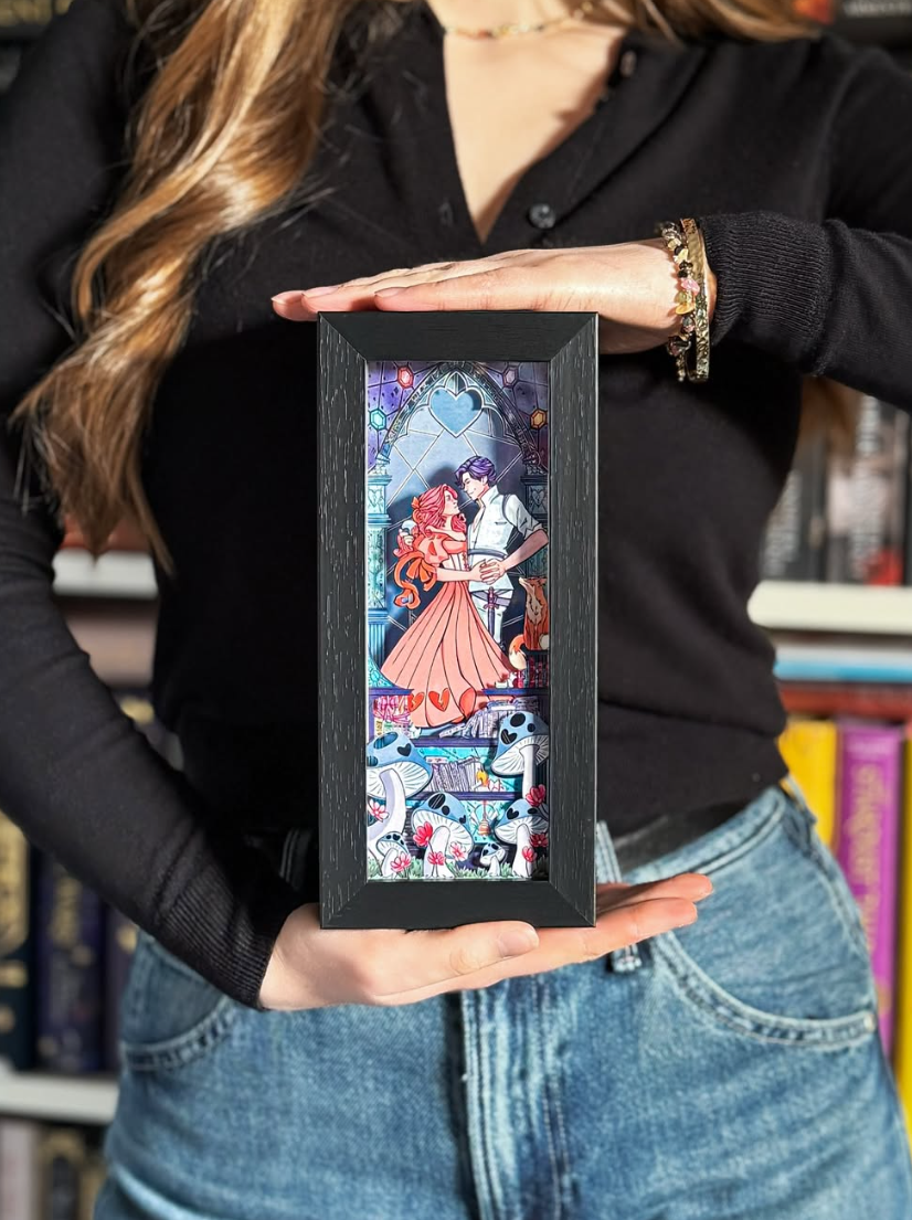 The perfect way to add a little light to your bookshelf! Enjoy our Once Upon A Broken Heart themed light box, illustrated by Isabelle Diaz (@procastle_studios). You can find Eva and Jacks embracing under a beautiful stained-glass archway. There are hidden easter eggs throughout the portrait, such as apples, a fox, keys, funny book titles, and a million broken hearts. Choose between blue or pink! P.S. Jacks's hair changes color!